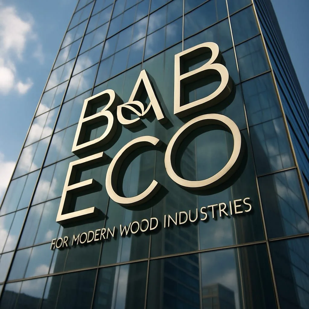 Close-up of a modern glass building with a large sign that reads 'BAB ECO for Modern Wood Industries'.