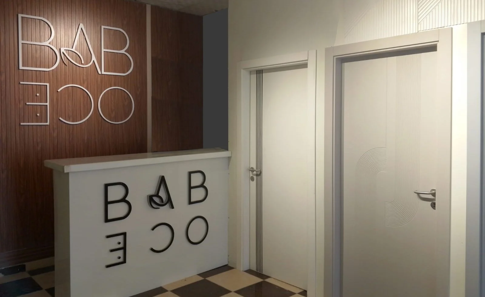 Reception desk with the words 'BABECO' and a wall behind with 'BABECO' in large white letters on a wooden background, and two doors nearby.
